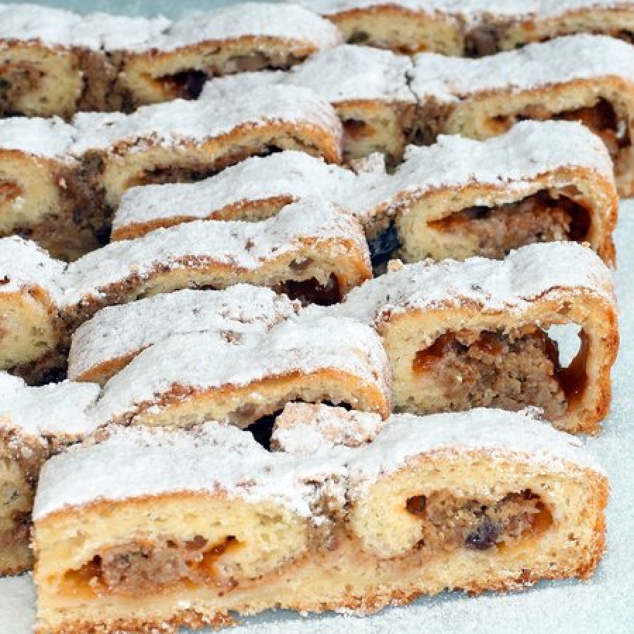 3 cipót formázunk, majd 1 órát pihentetjük. Ezután kinyújtjuk, középen hosszában 10-15 cm-sávot kihagyunk, a többi részt pedig megkenjük barack lekvárral. Egyik barack lekvárral megkent részre elosztjuk a darált diót, a másik felére pedig a mákot. Ezután egyik, majd másik irányból is óvatosan feltekerjük és a tepsibe helyezzük.